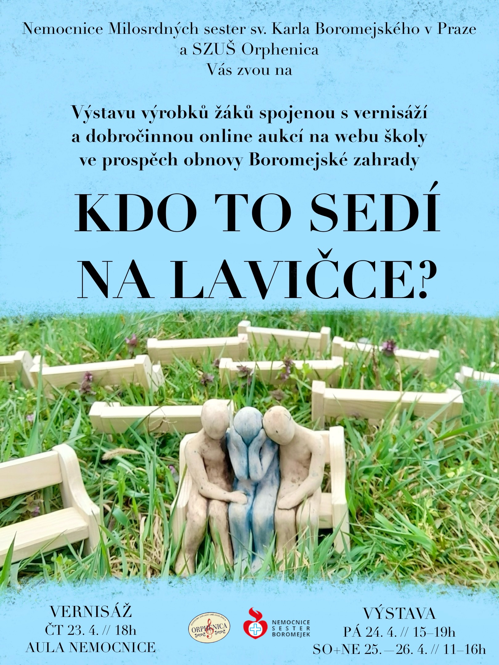 Ve čtvrtek 23. dubna se v aule Nemocnice Milosrdných sester svatého Karla Boromejského (Nemocnice Pod Petřínem) uskuteční vernisáž výstavy prací našich žáků, která bude spojena se zahájením online aukce. Výstava i aukce potrvají až do neděle. Zakoupením vystavených děl podpoříte obnovu Boromejské zahrady.